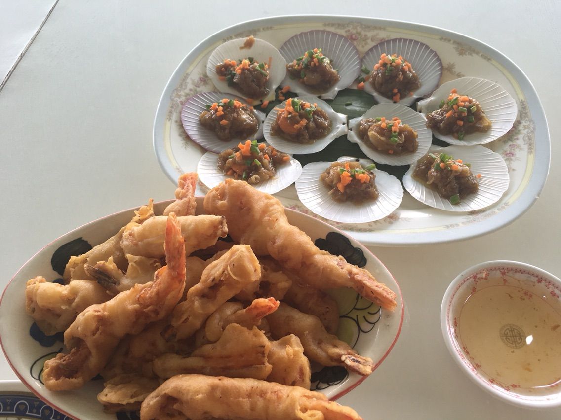 綺麗な貝殻に乗ったホタテと、海老フリッター