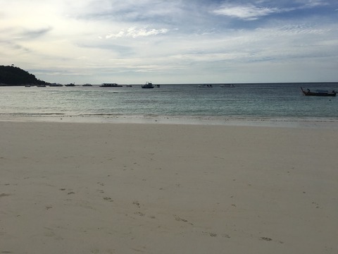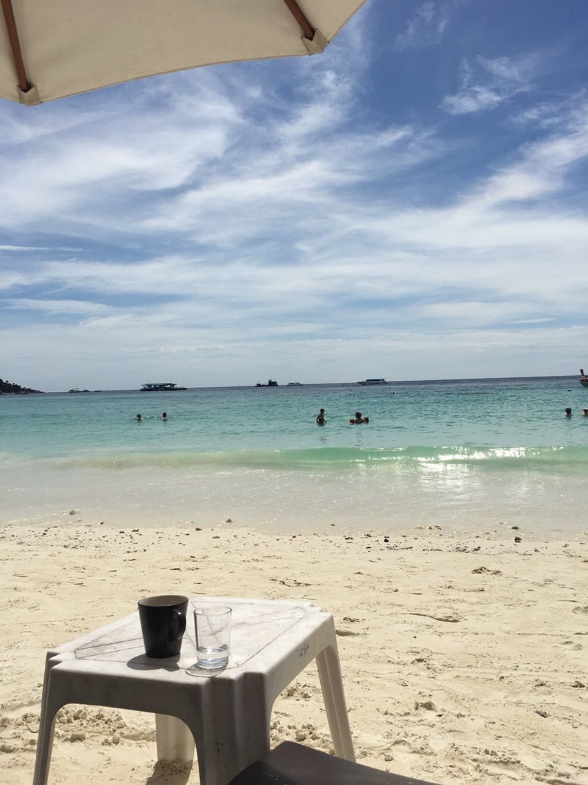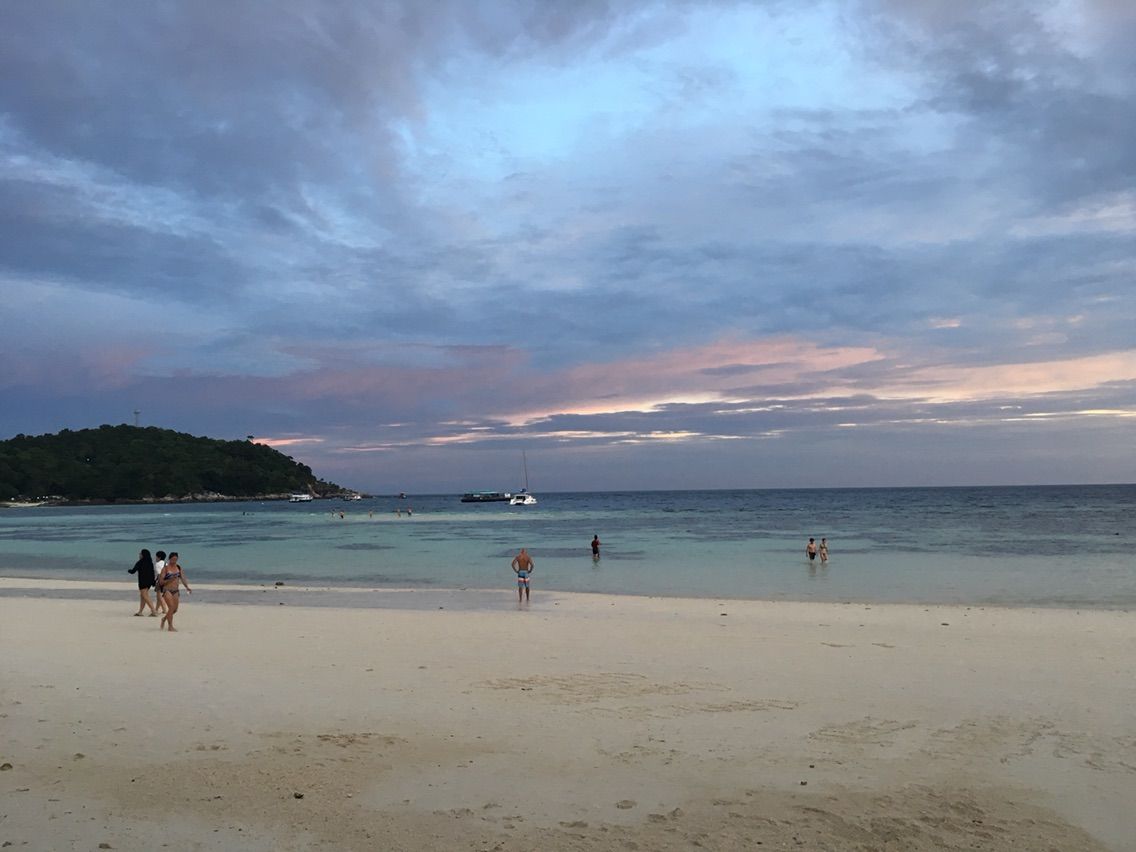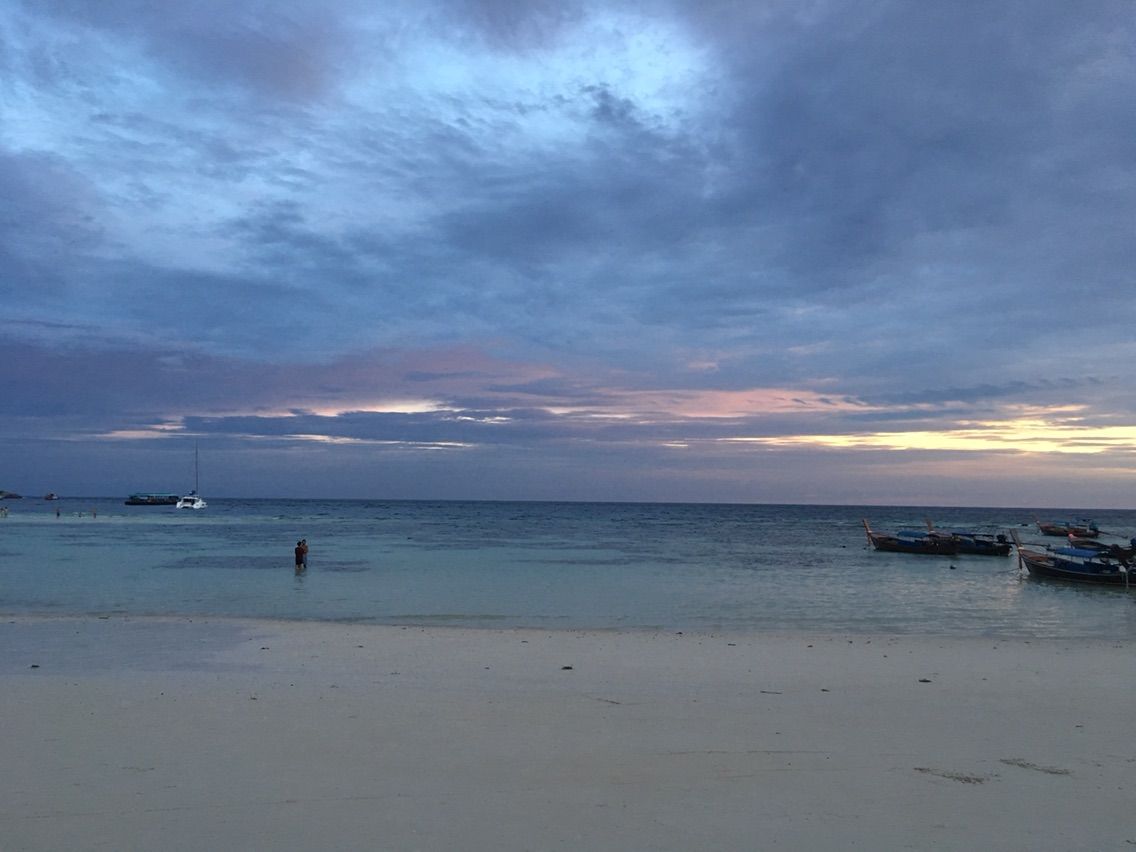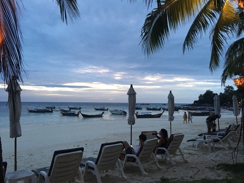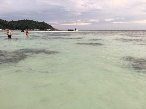 2018年01月27日 タイ最後の楽園リペ島⑩リペ島4日目の過ごし方 リペ島4日目。翌日は朝のフェリーで帰る為、リペ島最後の1日です。マリリゾート パタヤビーチの朝食。こうしてビーチで朝ごはんを食べれるのもこのホテルの良いところ。 こんな感じ 朝ご飯を食べたら早速ビーチベッドへ。 早速ワインを飲みながら。。 そしてランチはすぐお隣にあったイタリアンへ。ダイビングショップもやっているようでした。 Kioskinoというお店。 イタリア人がやっているお店 ニョッキとシンプルなパルメジャーノのパスタだったのだけど、これがすごく美味しくておかわりしたい位だった!!毎日タイ料理だったせいかもしれないけど・・ こんな景色を見ながらのランチ。パタヤビーチの方がサンライズビーチよりもレストランの選択肢は多いように思いました。 またビーチベッドに戻り海に入ったりして 次はマッサージへ。ビーチにいくつかマッサージ屋さんがありました。こんな場所で良い風を受けてマッサージ。 リペ島の海はなんというかエメラルドみたいな色だなぁ〜と。 午後潮が引いてきたらまた魚を見に行ったのですが、魚に噛まれた!結構痛くて丸い口の跡がついてます。。 段々潮が引いてきて 海の色も変わって 魚の大群!白い大きめの魚が凶暴で何度か足を噛まれた。 魚を見ながらも、何度も何度もこの景色を眺めてうっとり。 結構沖の方まで歩いていけます。 だんだん日が暮れてきて 絵画のような景色。この海の色と空の色。自然は何よりも美しいと思う瞬間。 更に暗くなり・・ 後ろ髪を引かれながらお部屋に戻りました。 本当に1日飲んで食べて、海に入って、魚を見て、また海を眺めっていうループのみなんだけど、これが本当に幸せな1日だった。