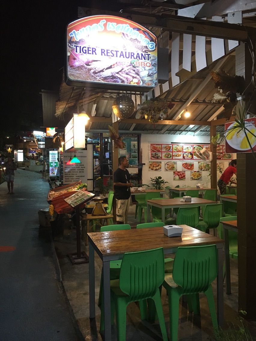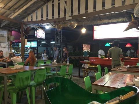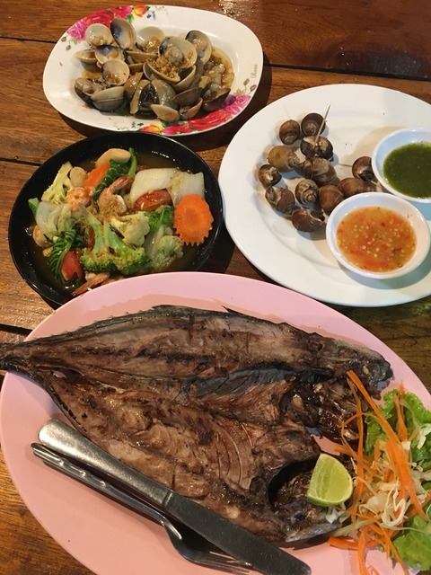 2018年01月30日 タイ最後の楽園リペ島⑪リペ島最後の夜 とうとうリペ島最後の夜・・。 パタヤビーチにはビーチにテーブルの出るこんなレストランもあります。 最後の夜、またウォーキングストリートを歩き、結局2日目に来て とても良かった「Tiger restaurant」へ。 こんな素朴なレストランです。 島ならではのシーフードを楽しもうと、こんな貝と 海老と野菜の炒めもの ハマグリみたいな貝と、魚のグリル。 島の夜は早く21時半位にはもうお客さんも皆帰り・・ でもお店で働くおばちゃんたちものんびりしています。 帰りにセブンの横に出てたこんなところで夜食を買い。。 部屋に戻ってちょっとワイン飲んで、リペ島の4日間が終了。 翌日は朝のフェリーで帰ります。 リペ島では毎晩こんな風にローカルなレストランで美味しいシーフード 食べて、値段もとても安くて、お店の人もとても素朴で・・。 そして気の合う親友と一緒にこういう旅ができる、それが何よりも 幸せなんだなって実感しました。