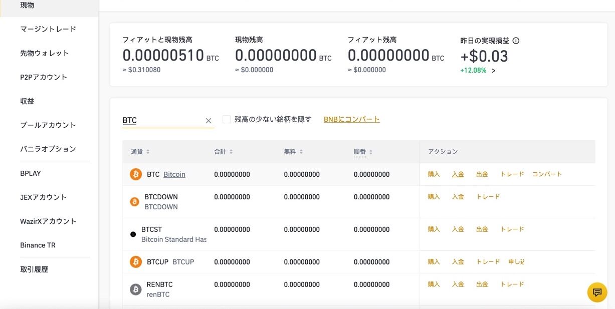 まずBinance の自分のウォレットからフィアットと現物(入金&出金)へ