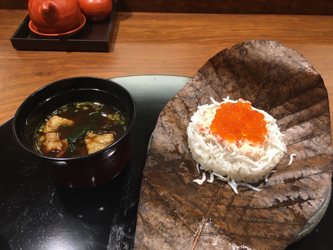 葉っぱを開けると・・蟹、しらす、いくらの贅沢なごはん!