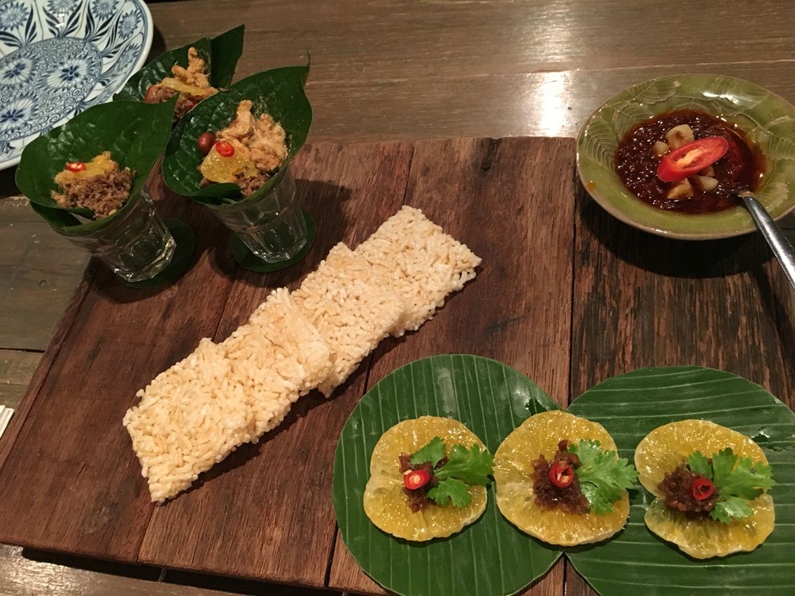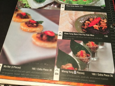 緑の葉っぱの中に色々なものが入っているのはミアンカムという有名なタイの前菜
